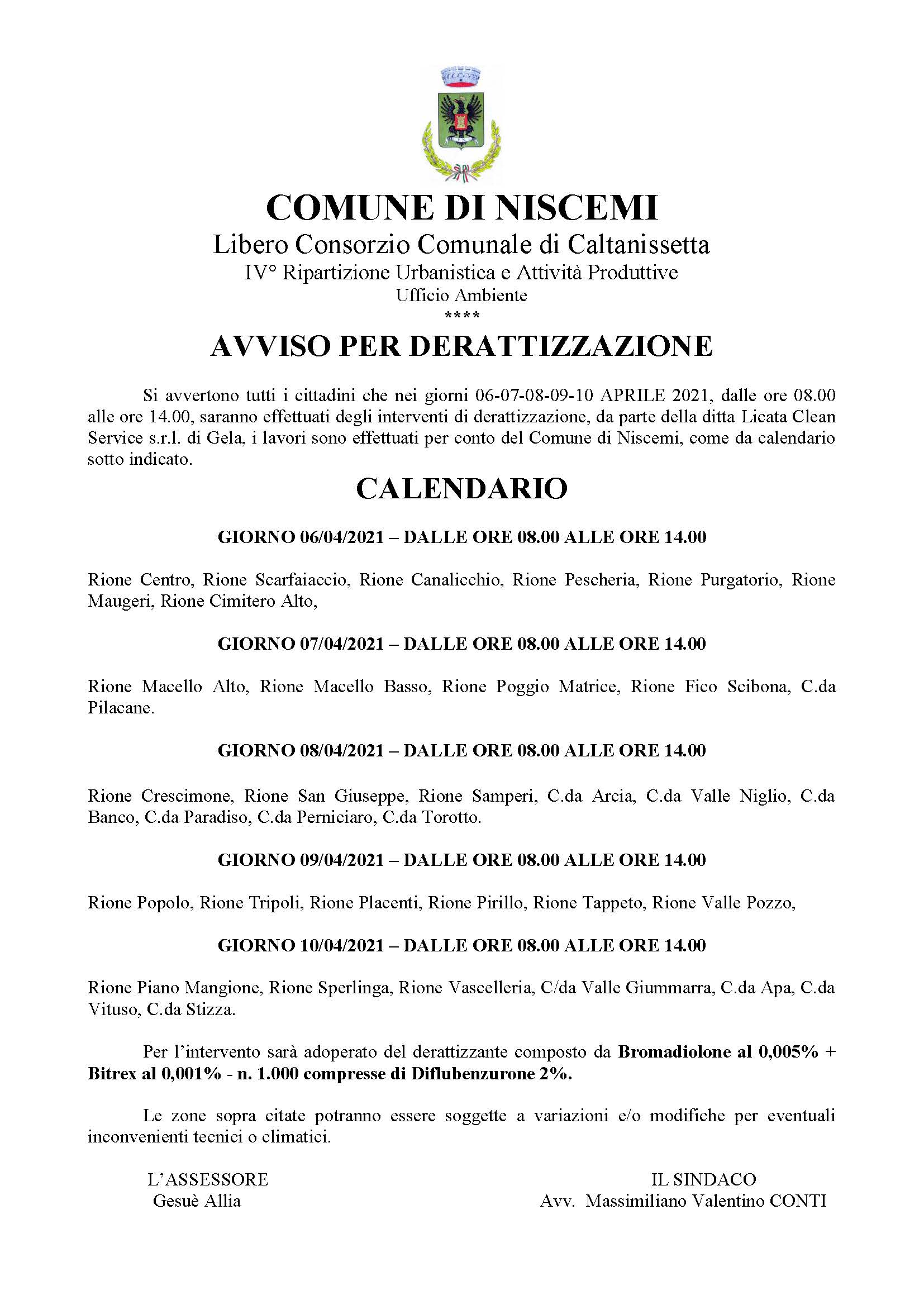 Si avvertono tutti i cittadini che nei giorni 06-07-08-09-10 APRILE 2021, dalle ore 08.00 alle ore 14.00, saranno effettuati degli interventi di derattizzazione, da parte della ditta Licata Clean Service s.r.l. di Gela, i lavori sono effettuati per conto del Comune di Niscemi, come da calendario sotto indicato.